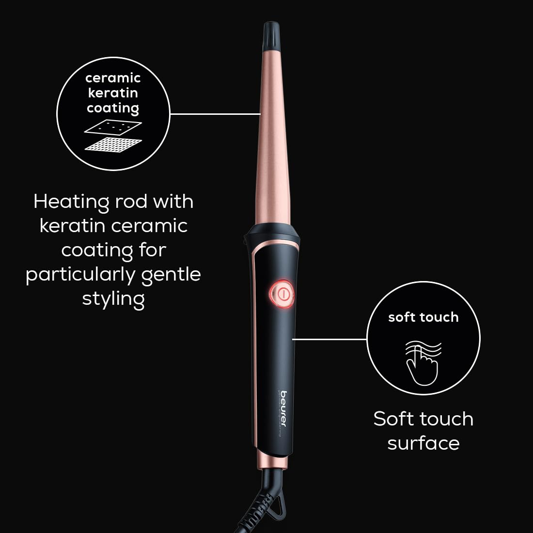 Beurer Professional Curling Tongs (13-25 mm) – Create soft, shiny curls effortlessly with a conical heating element and ceramic keratin coating for hair protection. Heats up fast to a constant 200°C with auto shut-off after 30 minutes. Features a 360° swivel cord, soft-touch grip, and a hanging loop for easy storage. Includes a heat-resistant glove. Powered by corded electric. 3-year warranty.
