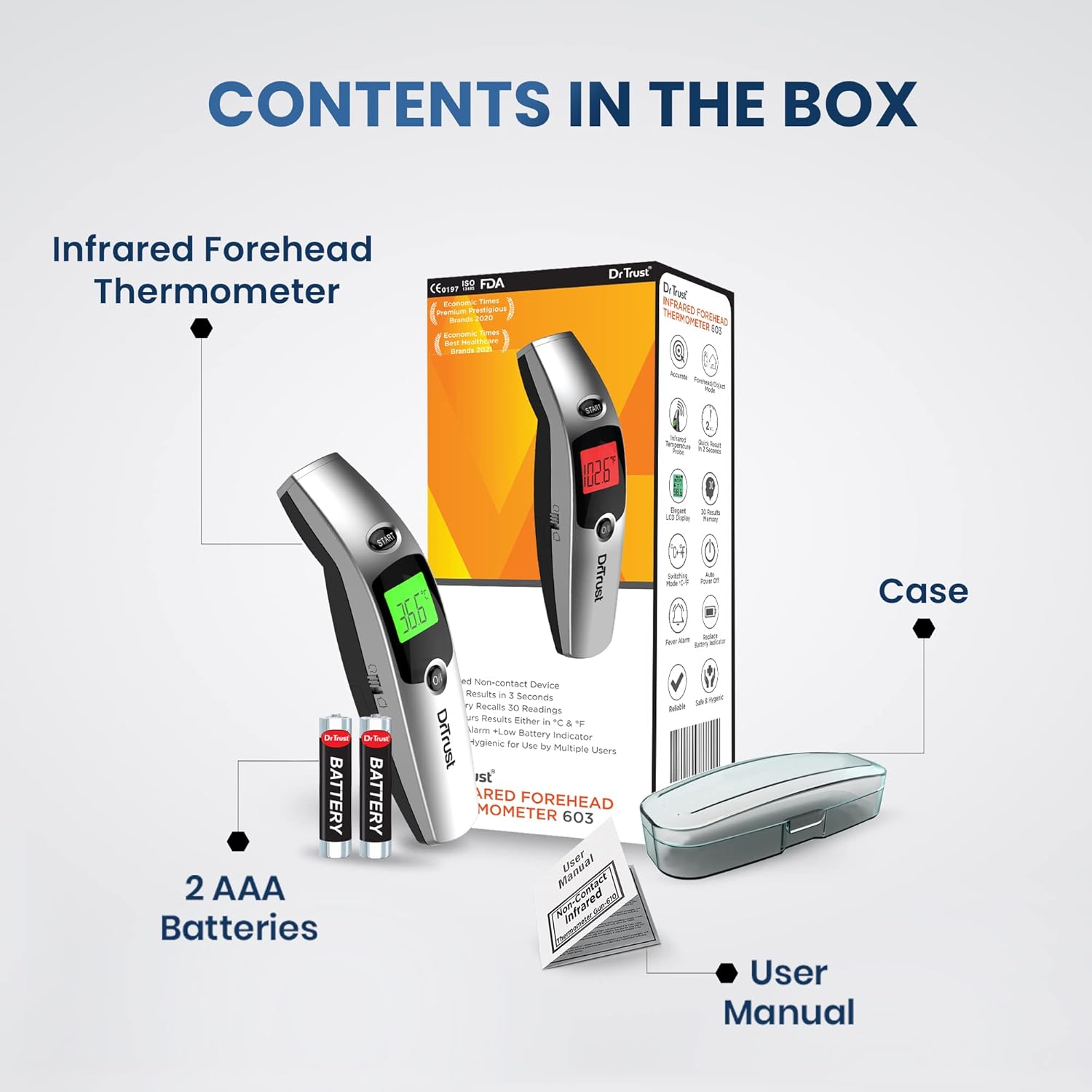 Dr Trust USA Infrared Forehead Temporal Artery Thermometer with Color Coded Fever Guidance works by scanning heat on the temporal artery of the forehead. Its technology ensures that you get an accurate temperature reading in 3 seconds. The thermometer scans and captures the naturally emitted infrared heat, and the arterial heat balances the software and synthesizes the reading determining the body temperature.